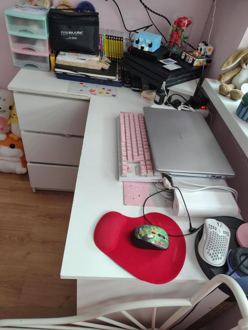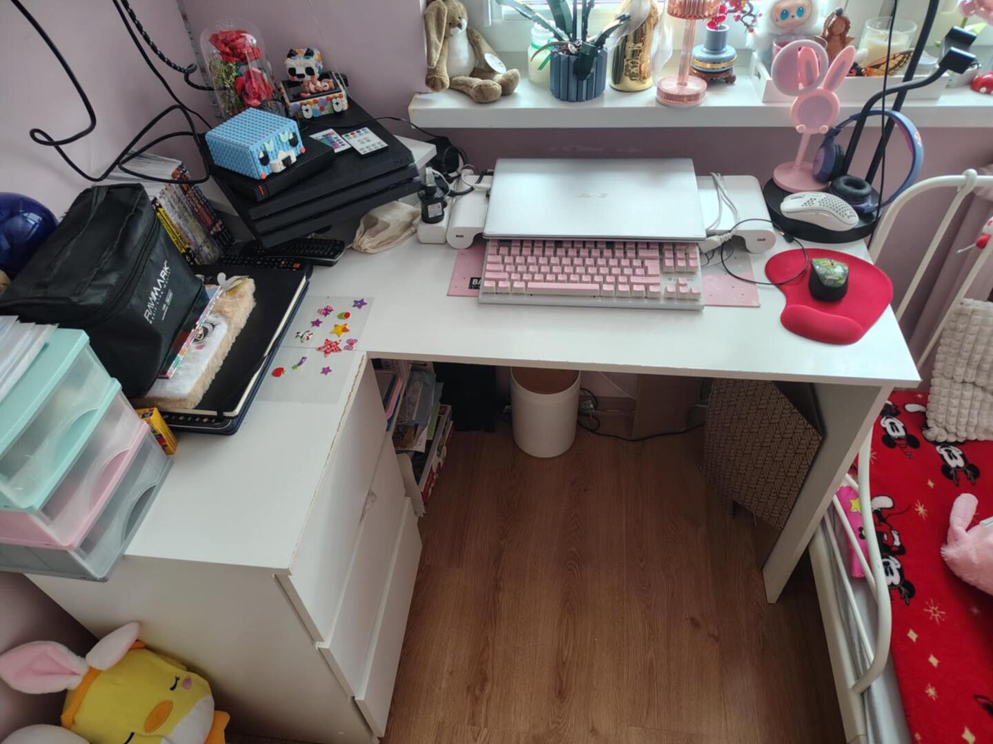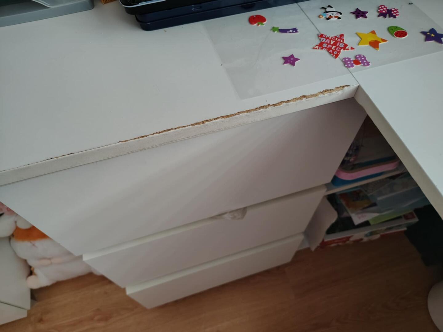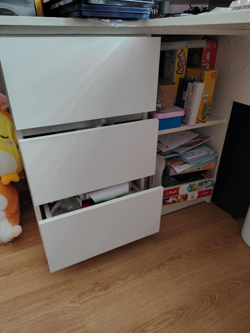 Biurko narożne białe używane przez dziewczynkę z śladami użytkowania. z płyty wiórowej