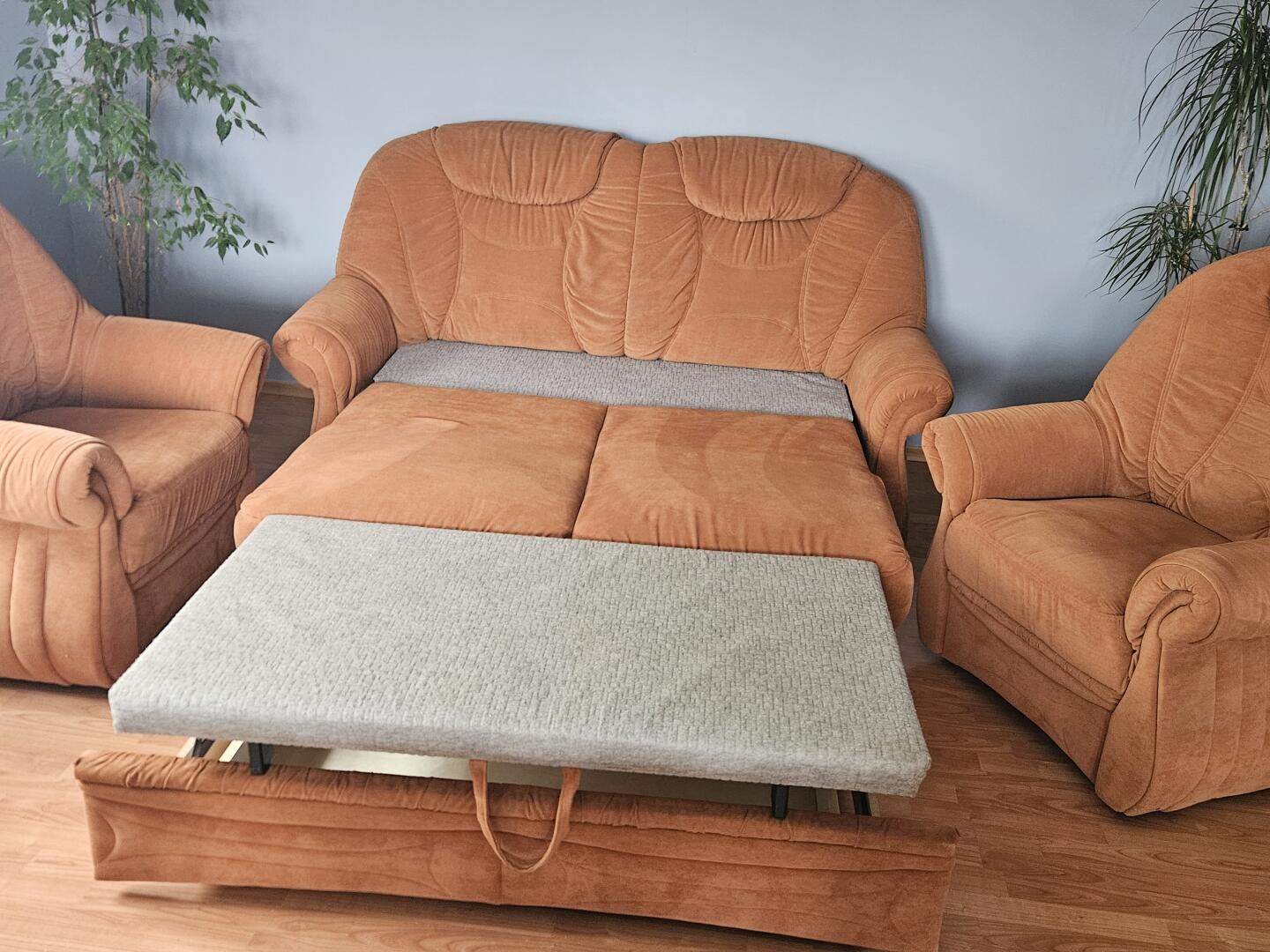 Sprzedam sofę 3-osobową z funkcją spania i pojemnikiem na pościel z dwoma fotelami. Zestaw w bardzo dobrym stanie. Odbiór osobisty.
