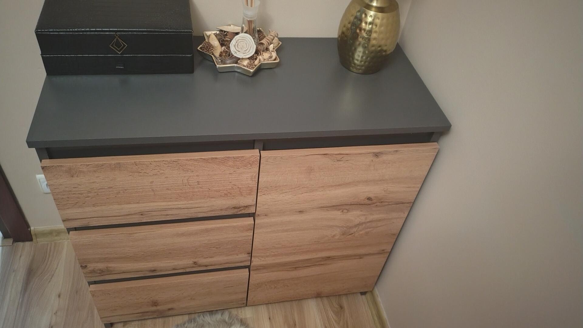 Komodę długości 80 cm, wysokości 75 cm. Kolor dąb wotan, grafit mat. Na górze blat lekko uszkodzony przy rogu ( uszkodzono przy transporcie).
